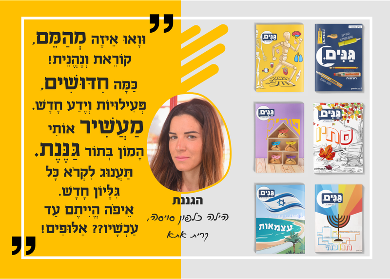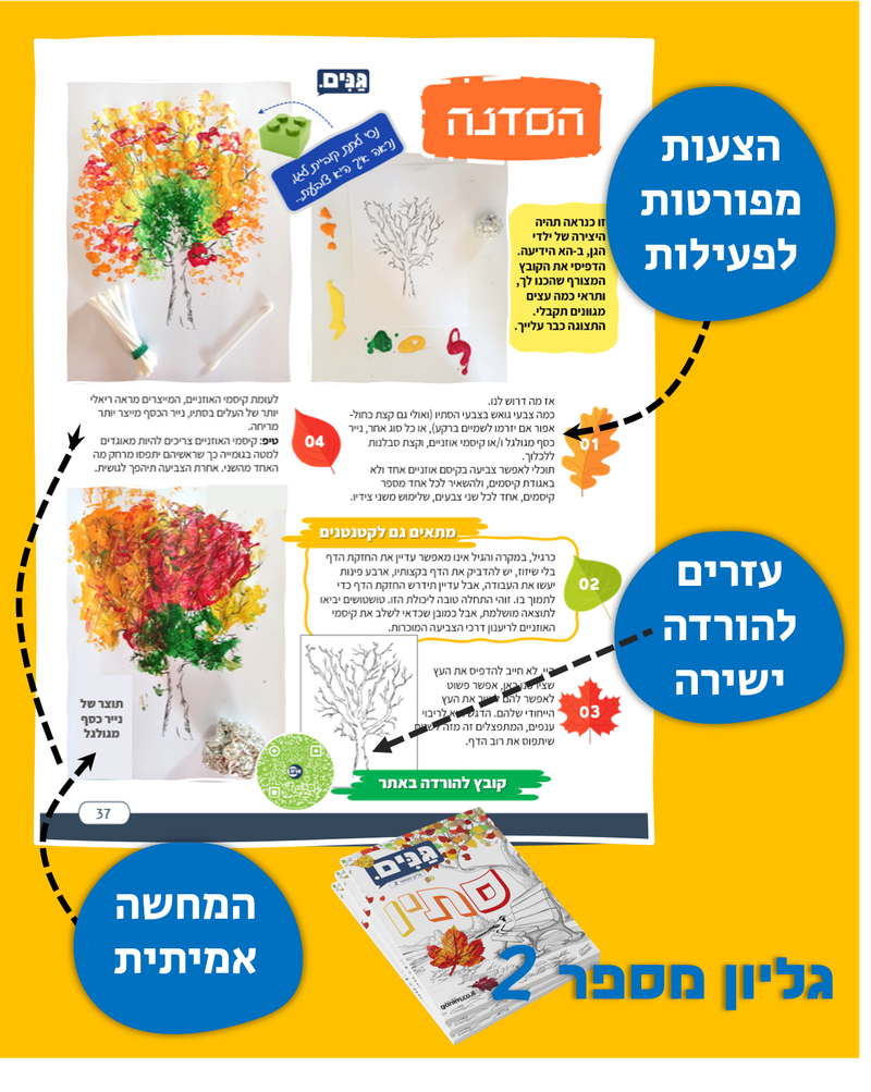 סביב כל נושא מרכזי שהגיליון יעסוק בו, נציג מגוון רעיונות לפעילות סביבו. פעילות חצר, מפגשים, תוכן לימודי, משחקים מתאימים ועוד. הרעיונות מקוריים, ואינם המוכרים והנפוצים. כל רעיון מוגש בעיצוב ברמה גבוהה, עם המחשה ברורה, ופירוט על אופן הביצוע והאפשרויות סביבו. בנוסף, עזרים ישירים להדפסה מצורפים לכל רעיון. לוחצים על קישור (או סורקים), ומדפיסים! ממש פשוט.