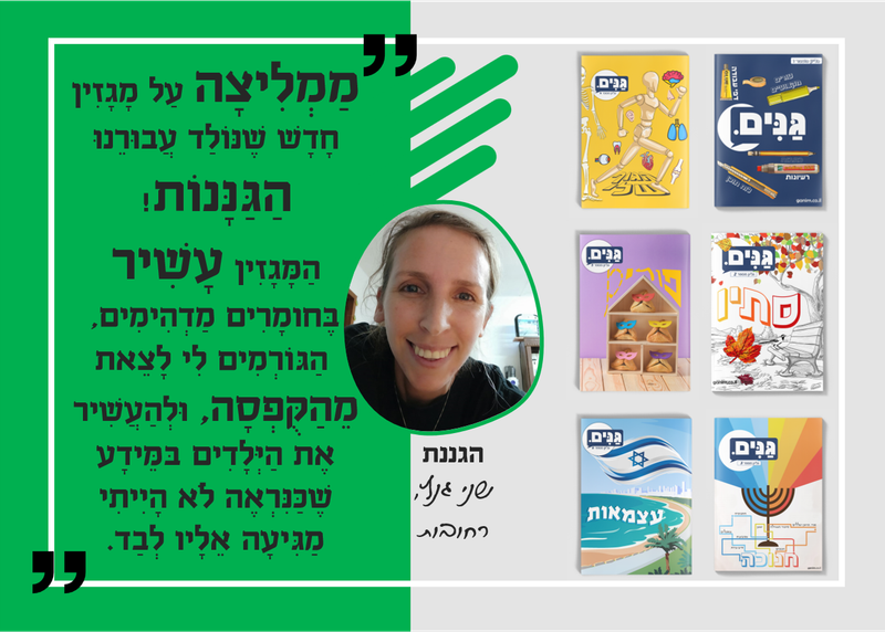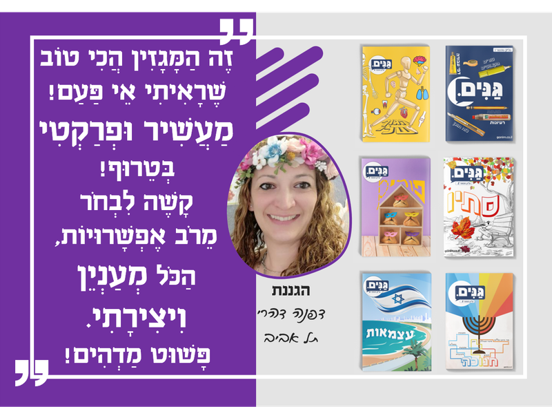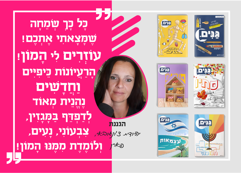 אין תחליף למגזין המודפס. נוח להרגיש את הדפים, לדפדף, ולא להיות ממוקדים במסך. אנחנו בעד, כך ניתן לעיין בנוחות ובעיון רב יותר. כל מנויה מקבלת גם את המגזין המודפס וגם את המגזין הדיגיטלי. סה"כ 8 מגזינים בשנה. דאגנו למנויות שלנו שיהיה להן מגזין דיגיטלי עם קישור אליו, נוח לצפייה. היתרונות שלו הם: 1. מהירות הגעת המגזין מרגע היציאה לאור, במקום לחכות למודפס בדואר. 2. נוח מאוד בצפייה במסך המחשב, עם קישורים ישירים להדפסה ולתכנים נוספים. 3. זמין תמיד בנייד, ומכל מקום, גם בגן! כ-74 עמודי כרומו, מעוצבים ברמה גבוהה, עם קודים לסריקה אשר מפנים למקורות הרלוונטיים ברשת, בדיוק כמו במגזין הדיגיטלי. במגזין הדיגיטלי יש מעט יותר עמודים, שם מופיעים בהרחבה דפי עבודה נוספים. אחת לחודש וחצי אנו שולחים מסרון ומייל לכל מנויה, עם קישור לצפייה ישירה במגזין הדיגיטלי, ובמקביל אורזים לה את המגזין האיכותי המודפס למשלוח בדואר.